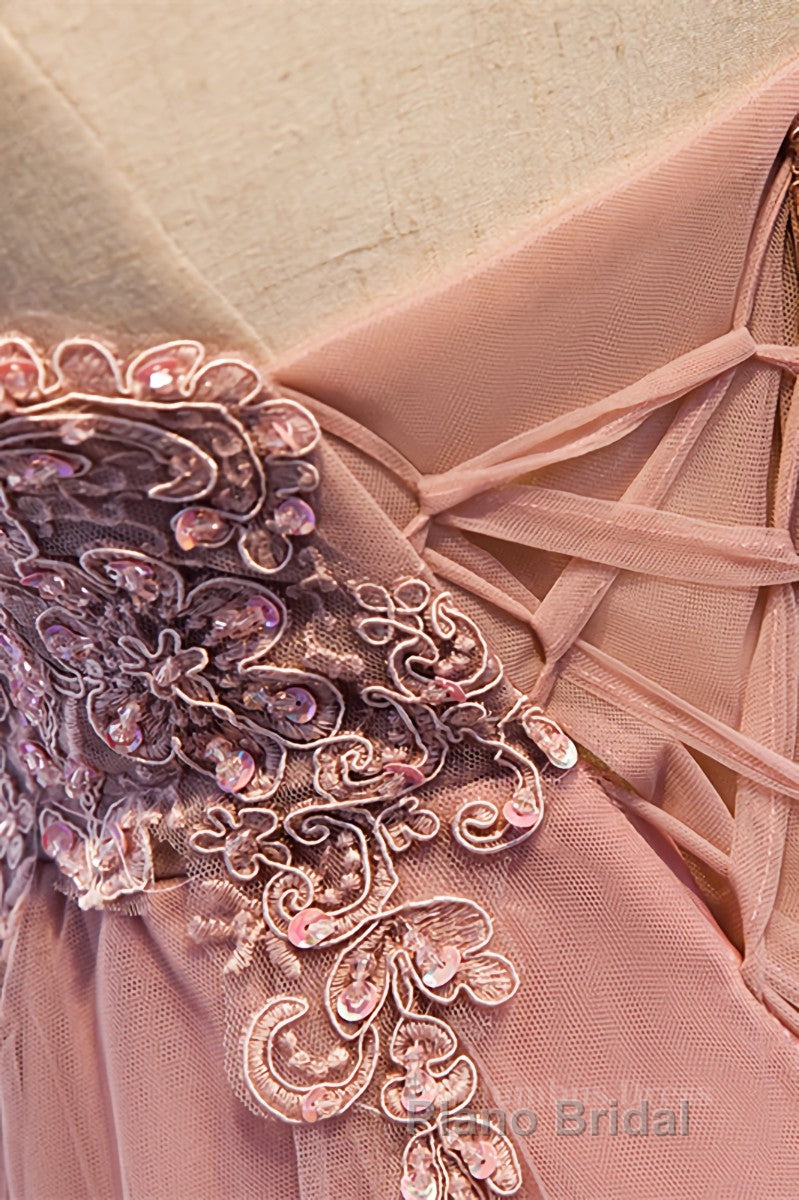 A-line Deep V Neck Beaded Appliques Multi-Layers Hi-Low Formal Dress