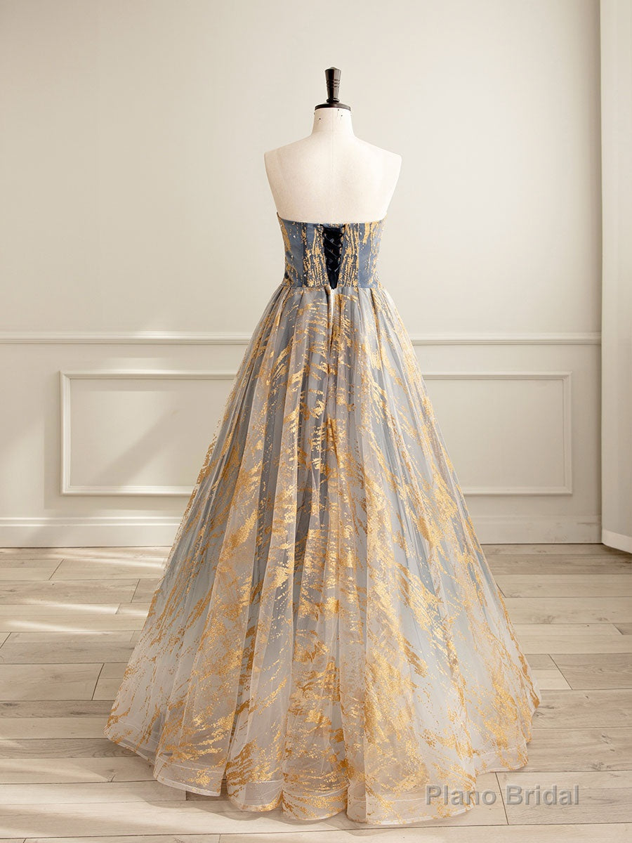 A-Line Tulle Gold/Blue Long Prom Dress, Blue Formal Evening Dress
