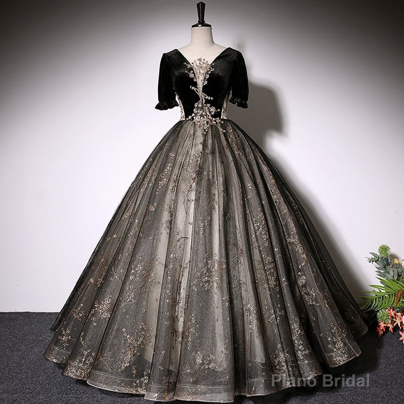 Beautiful Black Tulle Short Sleeves Long Party Dress Black Short Sleeves Prom Dress prom dresses shops