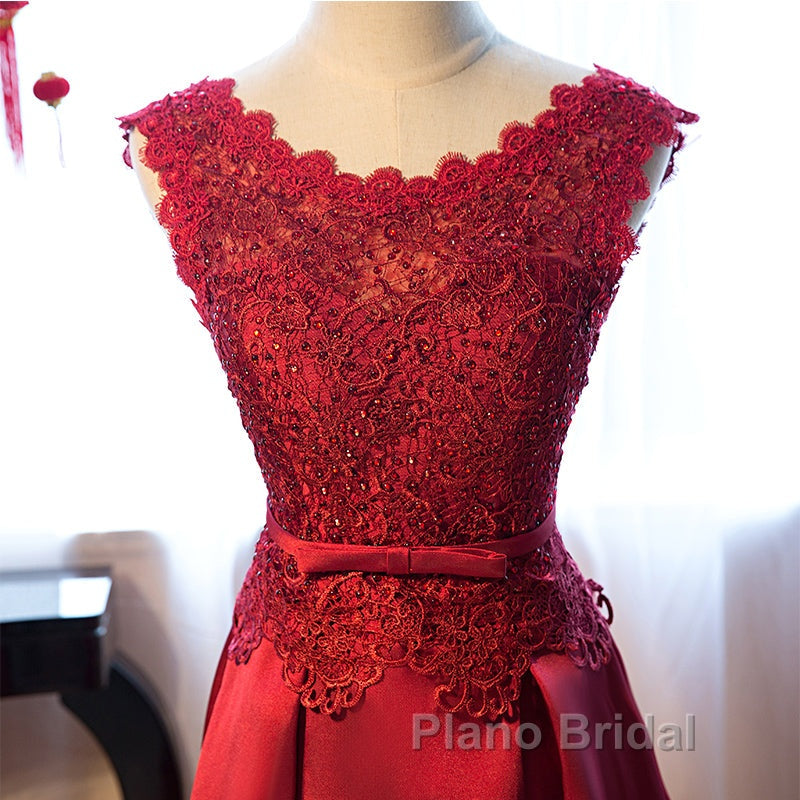 Beautiful Dark Red Lace Long Junior Formal Prom Dresses, Lace Top Party Dresses