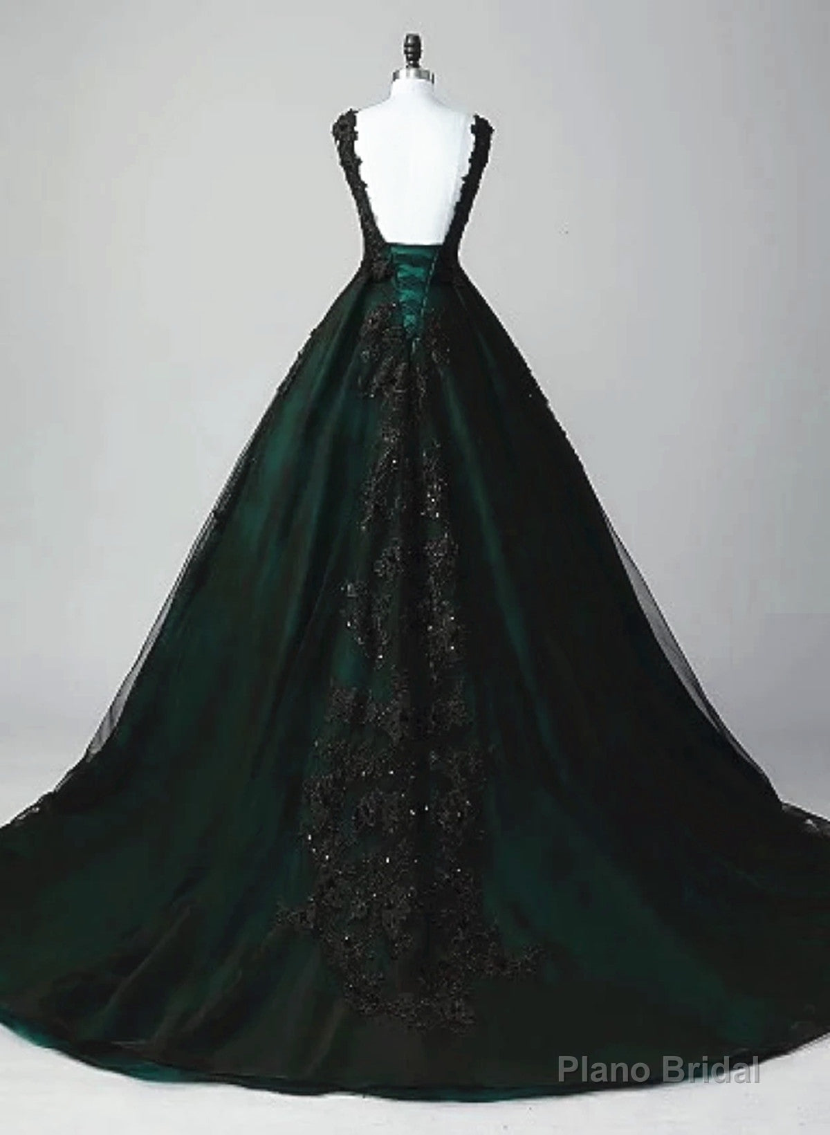 Black and Green Tulle with Lace Long Party Dress, A-line Low Back Evening Dress