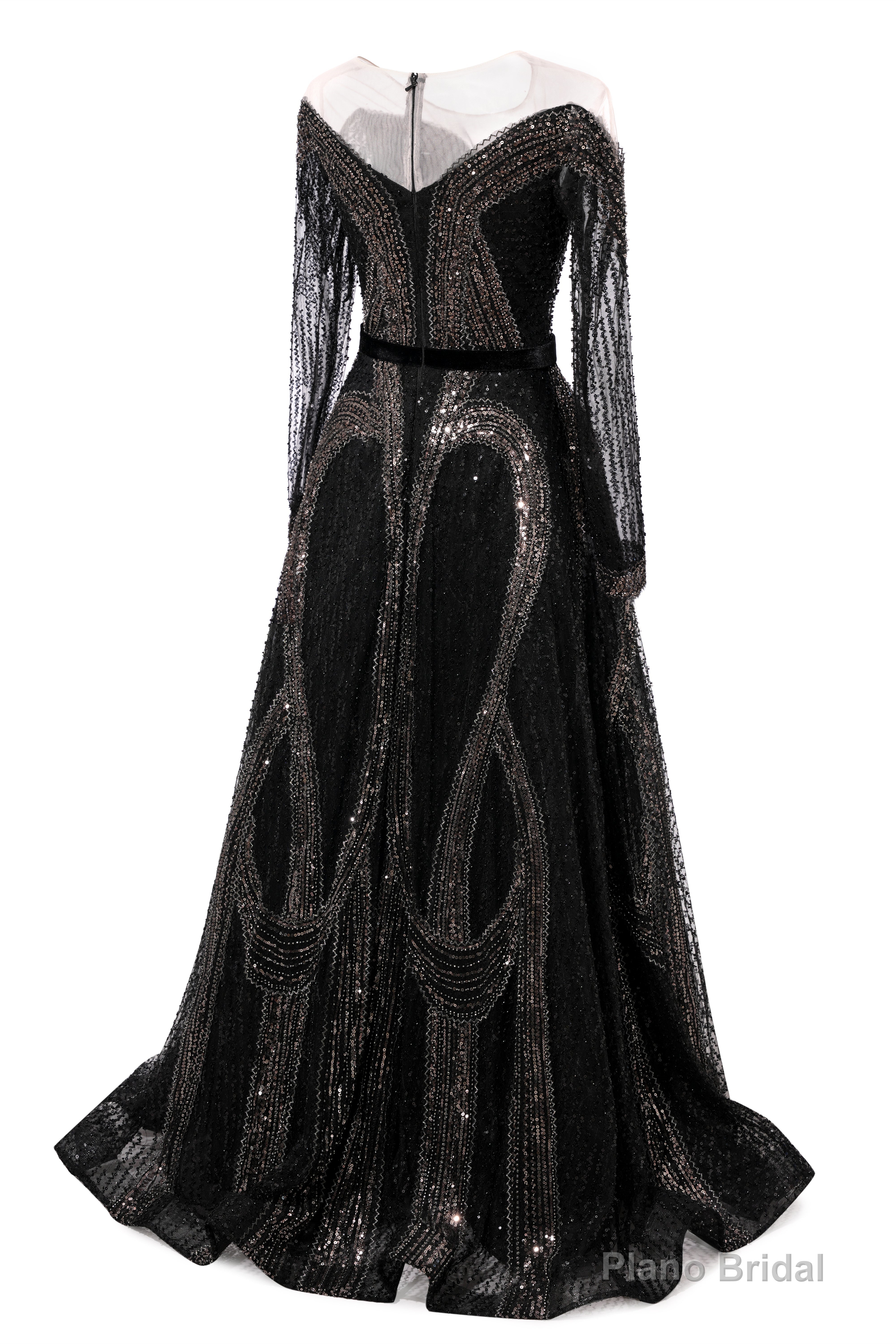 Black Prom Dresses A-line Heavily Beading Long Sleeves Women Evening Dresses
