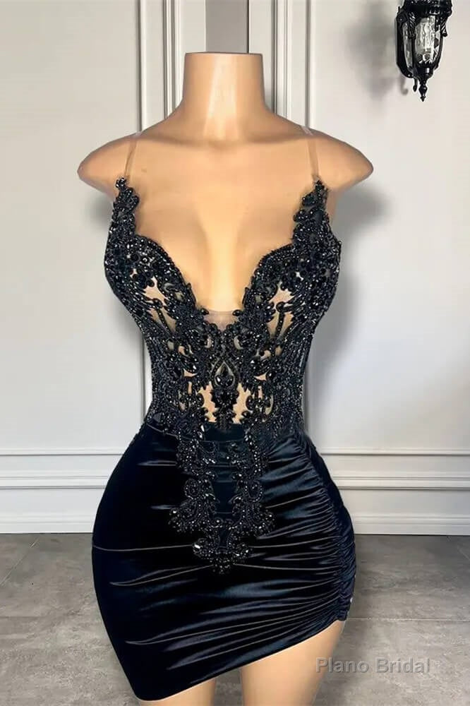 Black Sleeveless Short Prom Dresses with Spaghetti Straps and Beadings