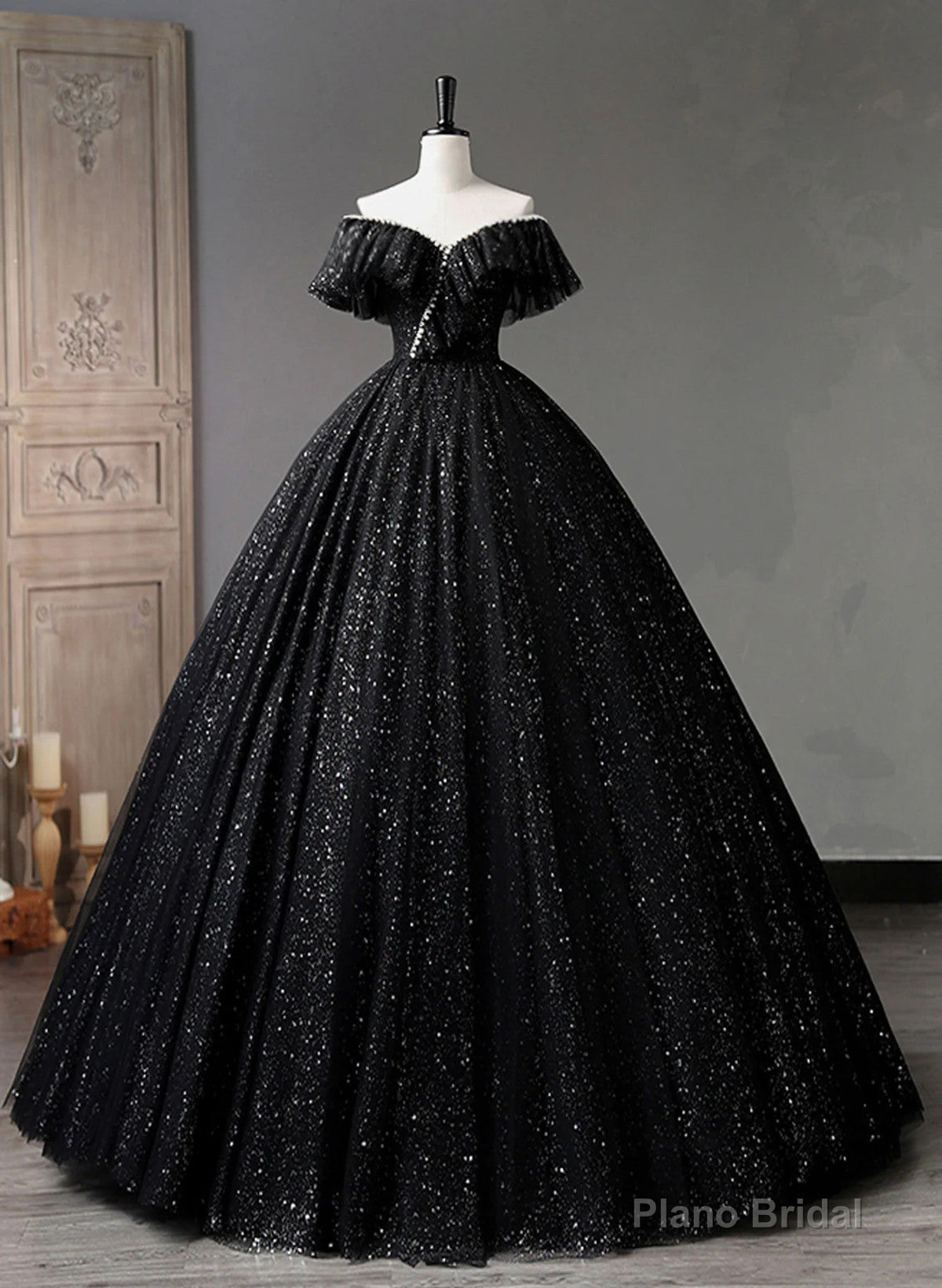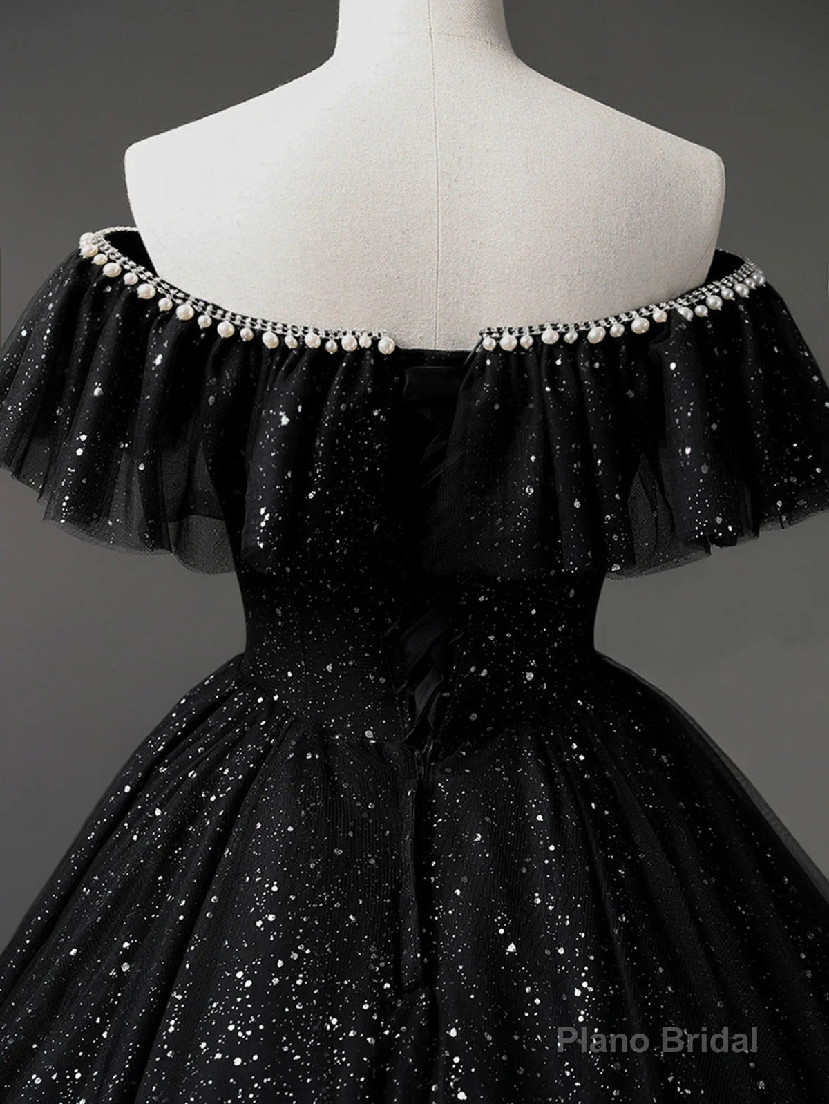 Black Tulle Beaded Long Formal Gown, Black Tulle A-line Prom Dress