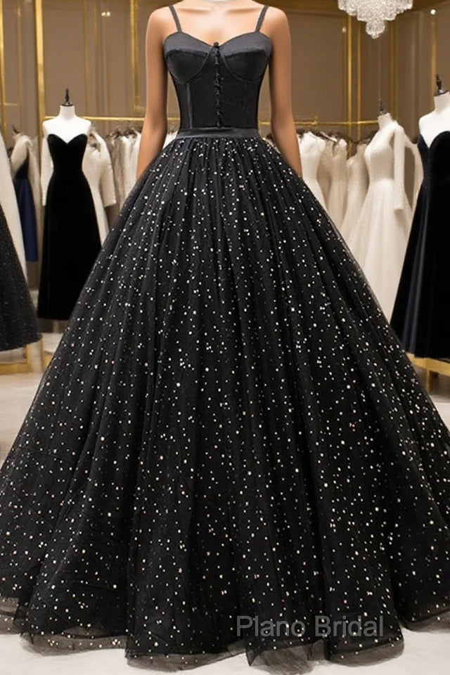 Black Tulle Long Formal Prom Dresses, Black Spaghetti Straps Formal Gown