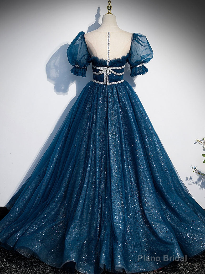 Blue Tulle Off Shoulder Long Prom Dress, Blue Tulle Formal Dress