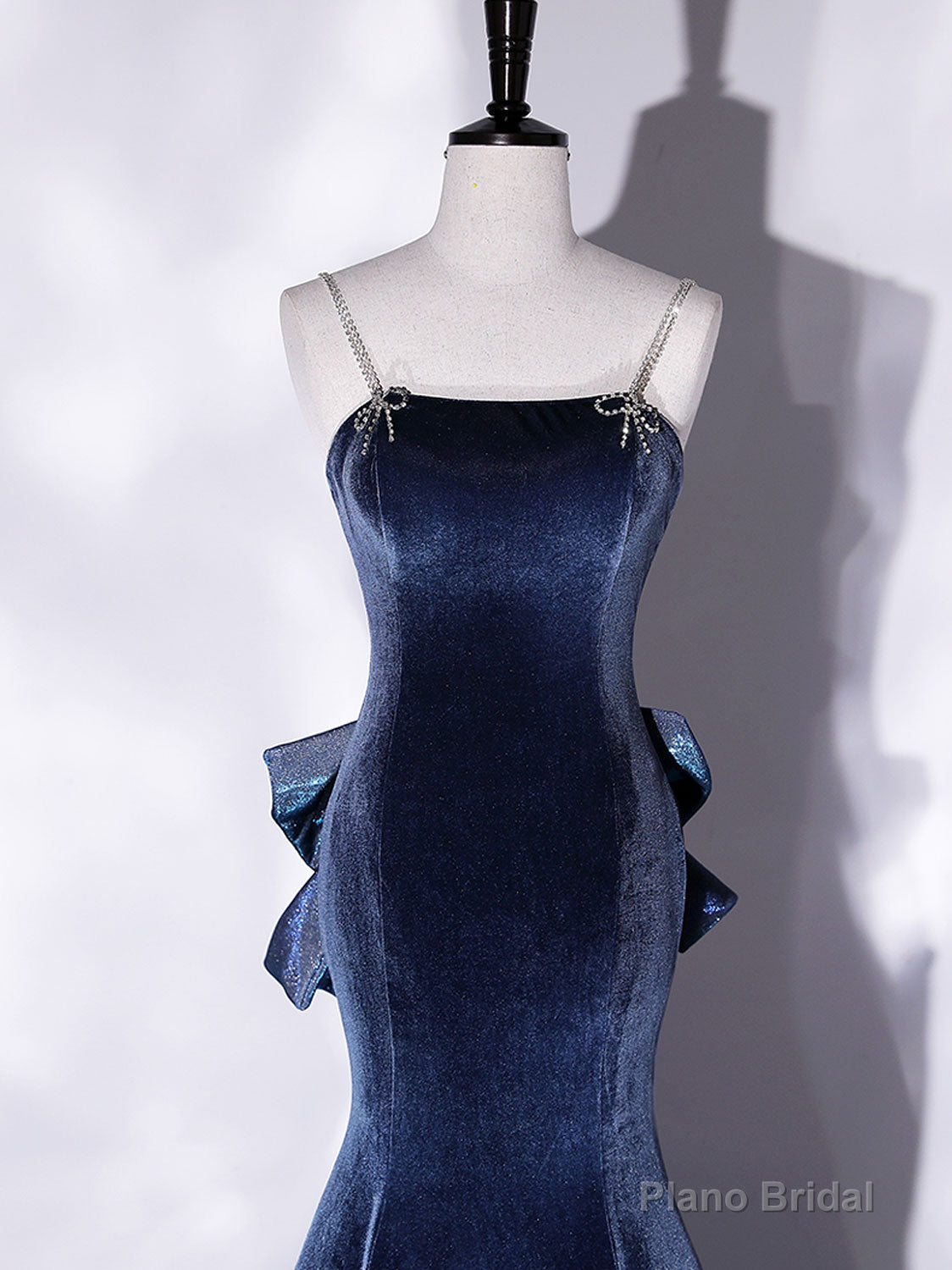 Blue Unique Mermaid Velvet Long Prom Dresses, Velvet Formal Evening Dresses