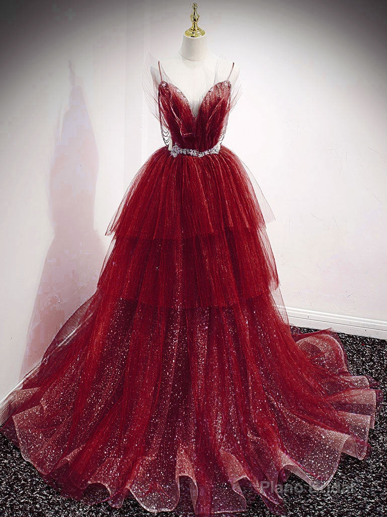 Blue V Neck Tulle Sequin Long Prom Dress, Blue Tulle Formal Dress