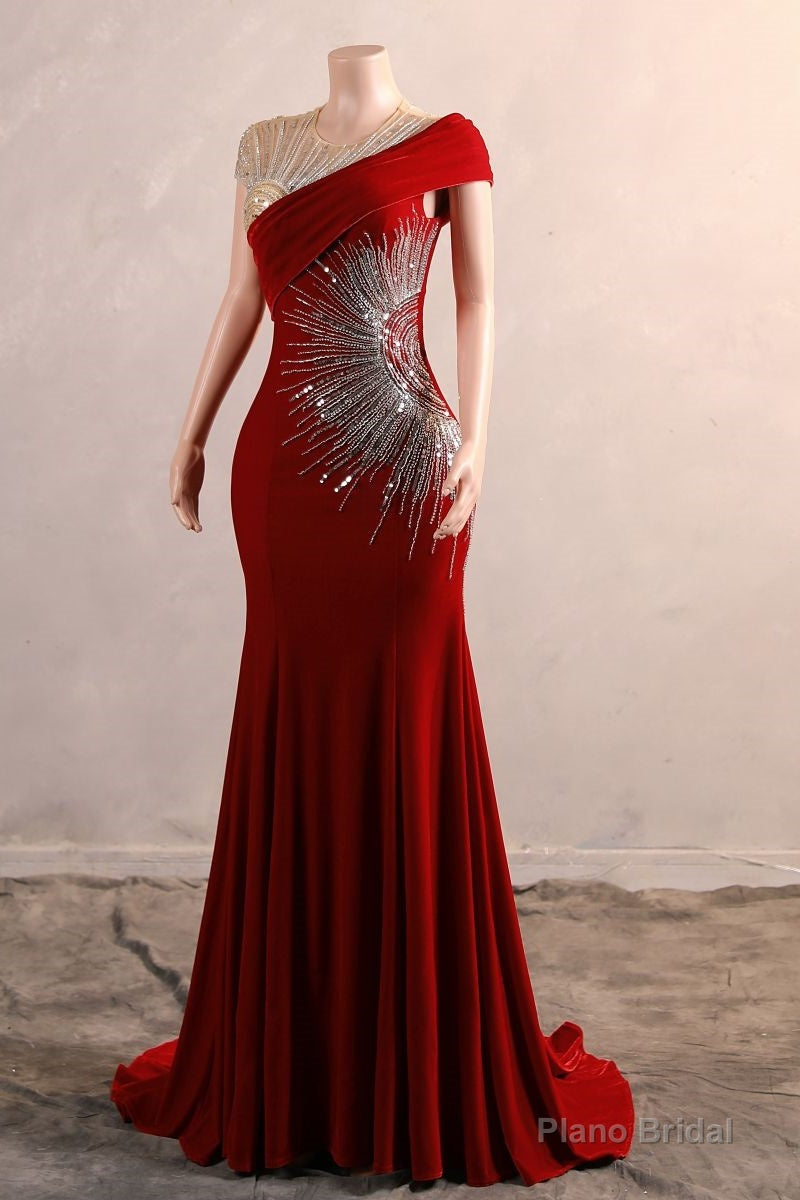 Burgundy Prom Dresses Bodycon Velvet Long Formal Dresses with Embroidered Beadings