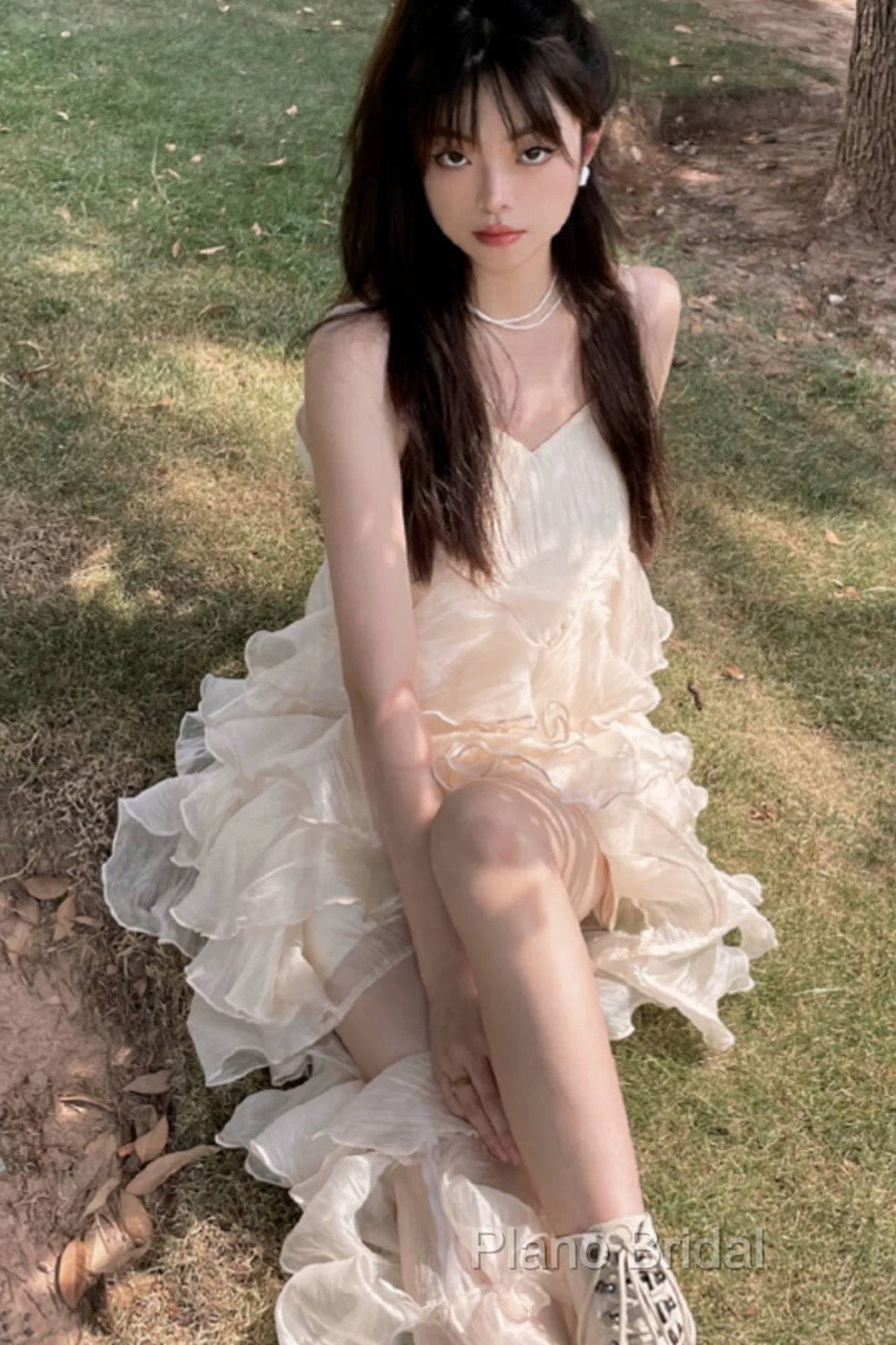 Chic High Low Spaghetti Straps Formal Prom Dresses Birthday Dresses With Ruffles