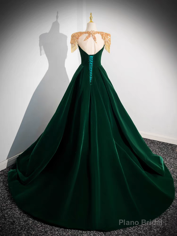 Dark Green Velvet Prom Dress Vintage Gold Beaded Neckline Evening Gown