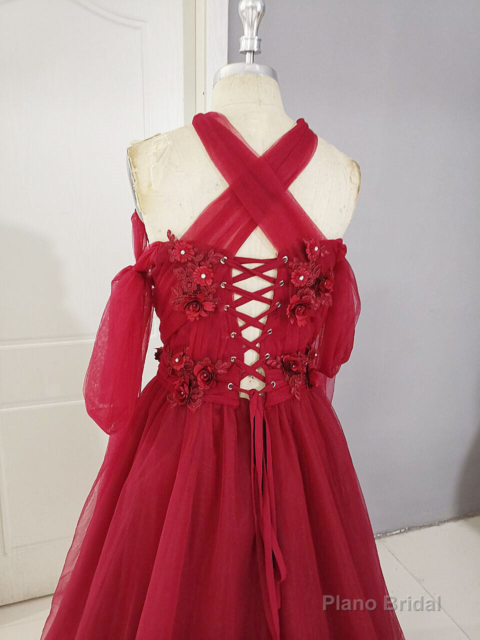 Dark Red Tulle Lace Long Prom Dress, Red Tulle Lace Evening Dress