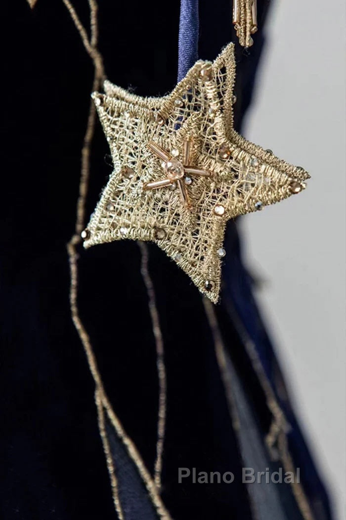 Elegant Navy Blue Spaghetti Strap Long Formal Prom Dresses With Star