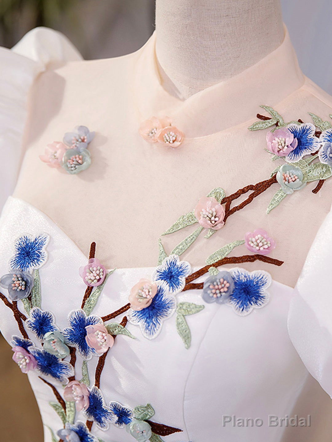 Elegant White Tulle Appliques Long Prom Dress, White High Neck A-Line Evening Dress
