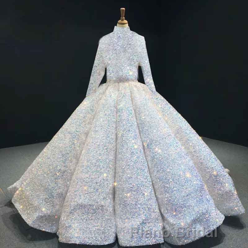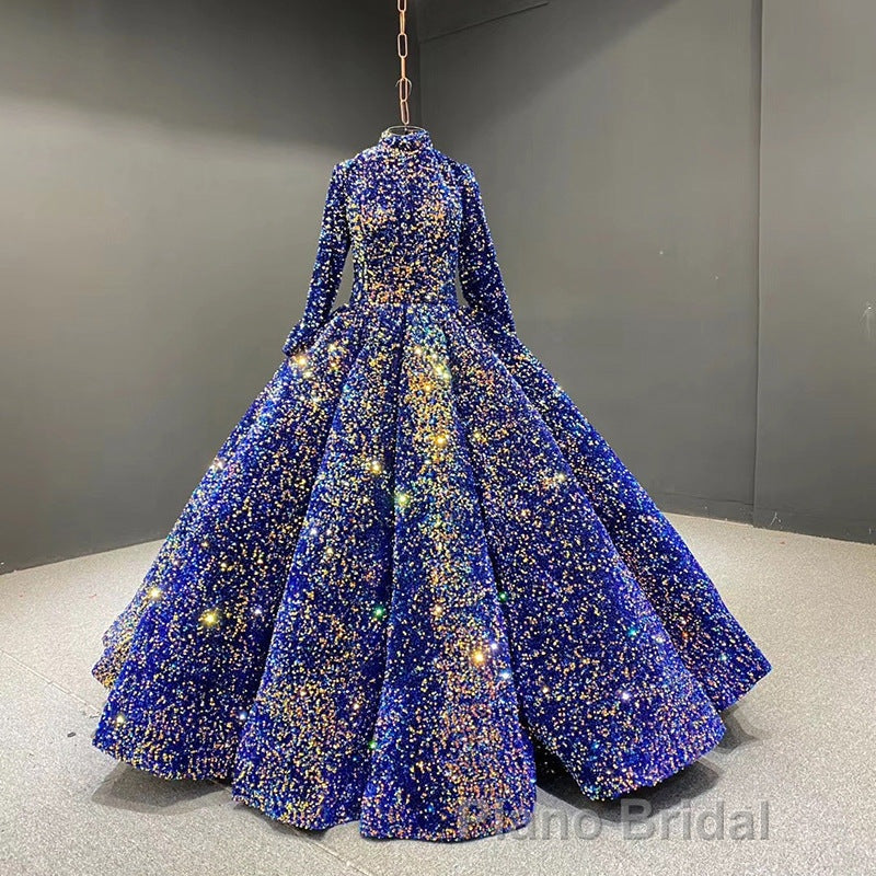 Glitter High Neck Open Back Lace Up Ball Gown Formal Prom Dresses