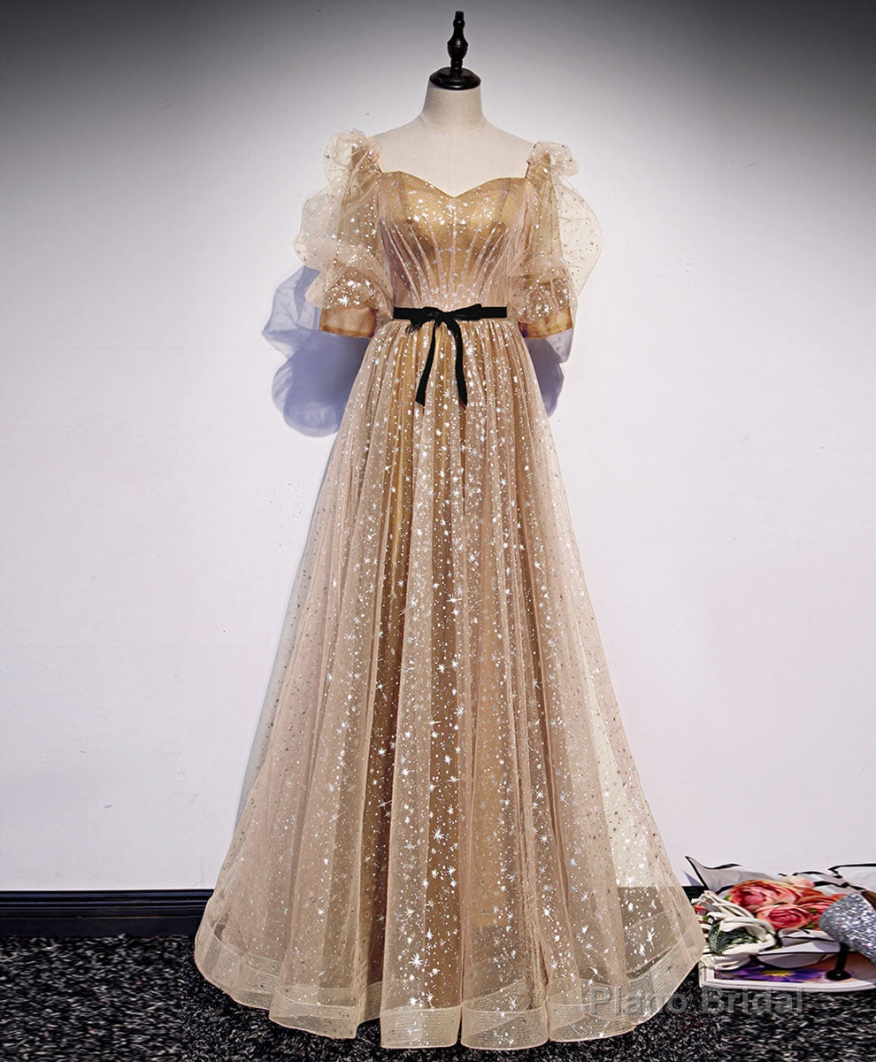 Gold Tulle Long Prom Dress, A line Gold Formal Graduation Party Dress