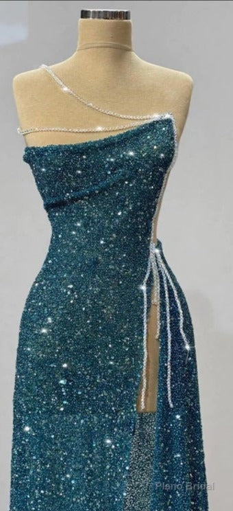 Gorgeous Teal Sheath High Slit Maxi Long Prom Dresses,Evening Dresses