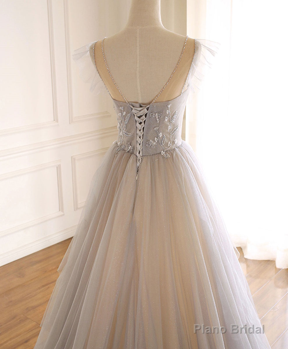 Gray Purple Round Neck Tulle Long Prom Dress, A line Formal Graduation Dress