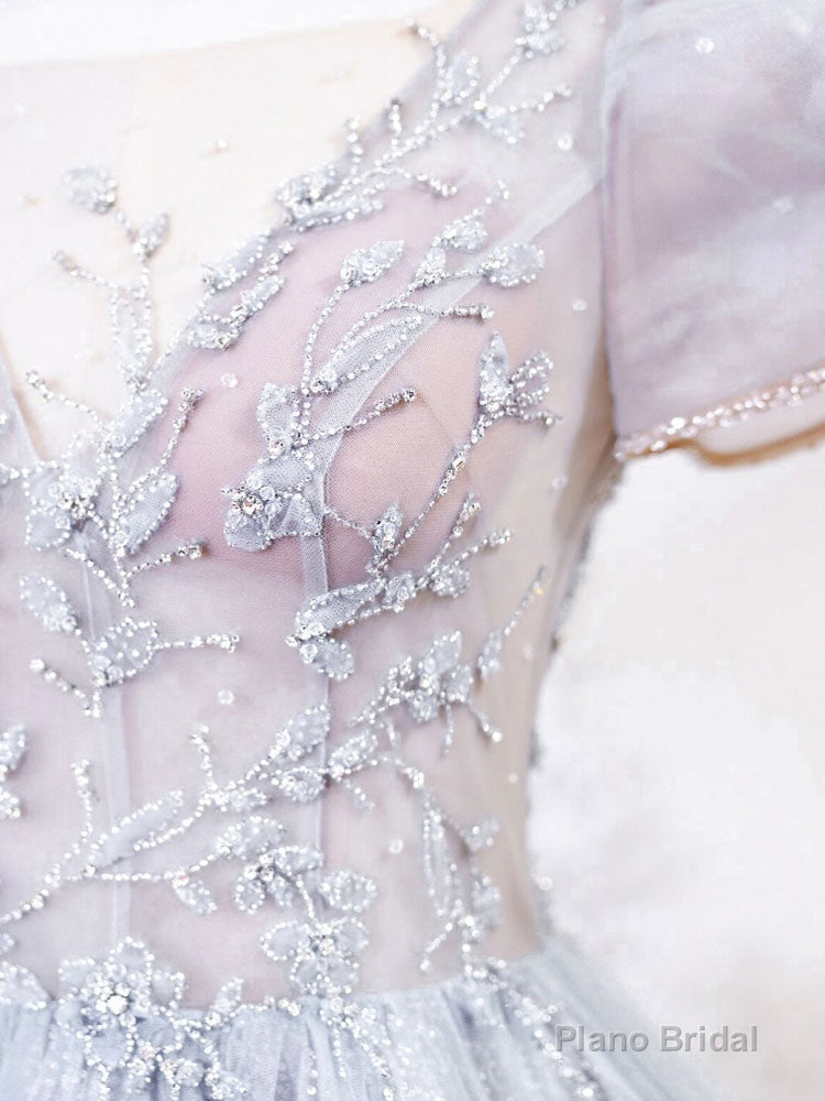 Gray Round Neck Tulle Lace Long Prom Dress, Gray Tulle Evening Dress