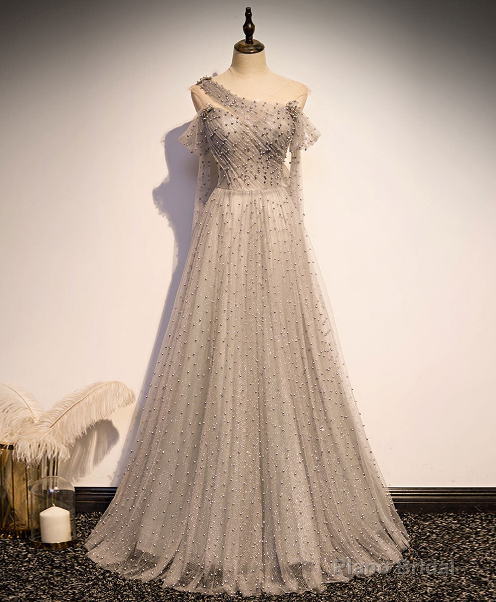 Gray Tulle One Shoulder Long Prom Dress, Gray Formal Graduation Dresses with Beading