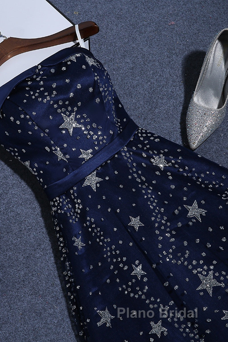 Navy Blue A-Line Tulle Long Evening Dresses, Navy Blue Formal Prom Dresses