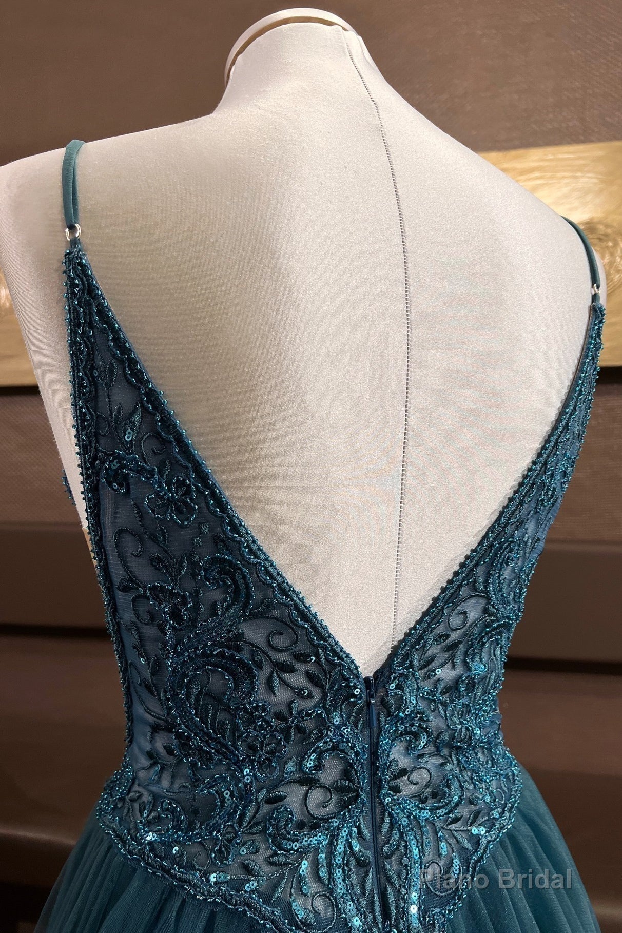 Pine A-line Plunging V Neck Appliques Sequins Tulle Long Prom Dress