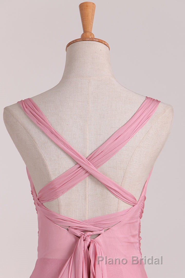 Pink V-Neck Lace-Up Long Bridesmaid Dresses
