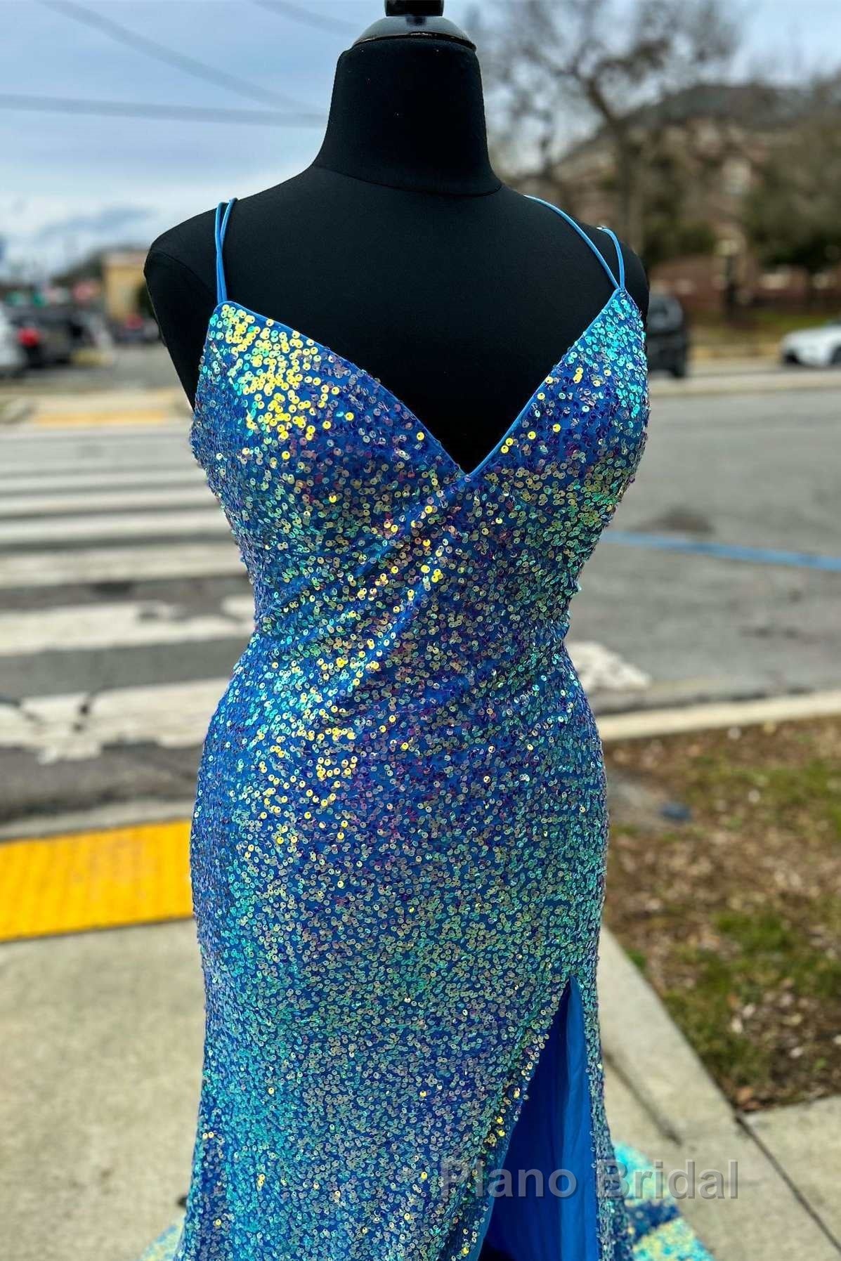 Purple Iridescent Sequin Empire Waist Lace-Up Mermaid Long Dresses with Slit