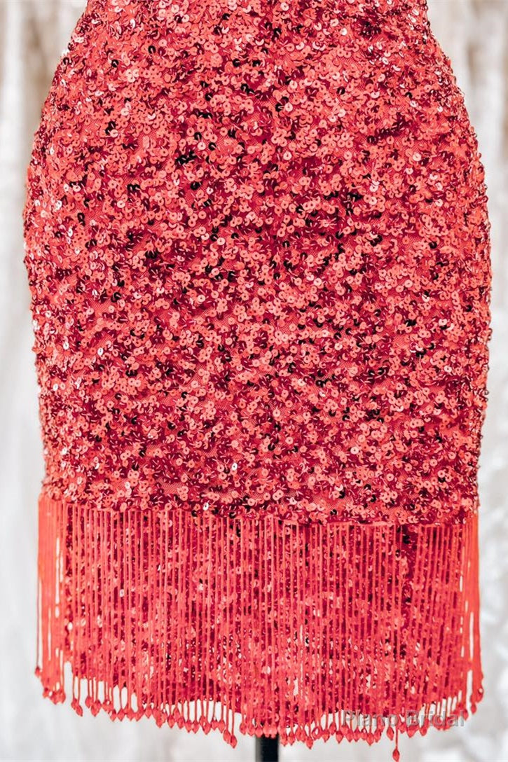 Red Lace-Up Sequins Sheath V Neck Homecoming Dress with Tassels