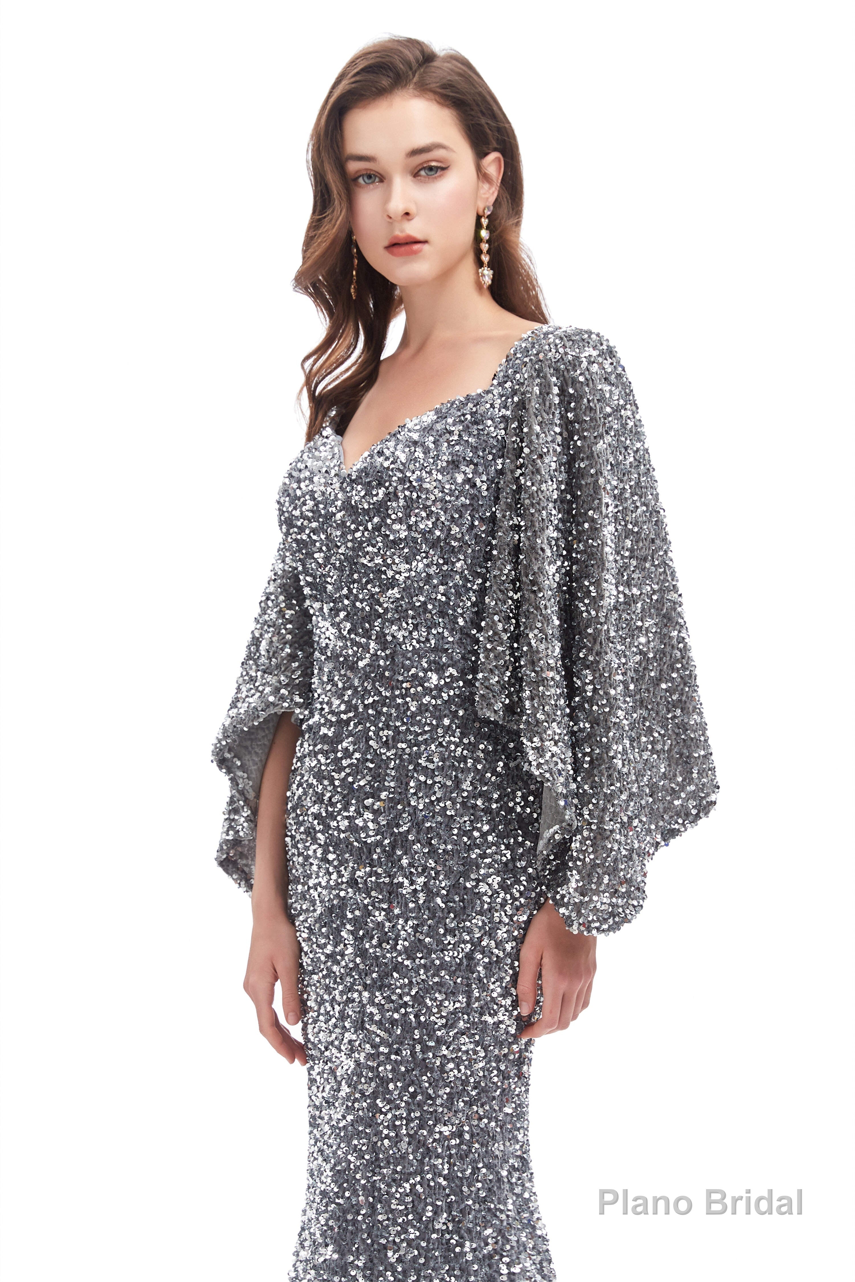V-Neck Sequins Mermaid Prom Dresses with Sleeves