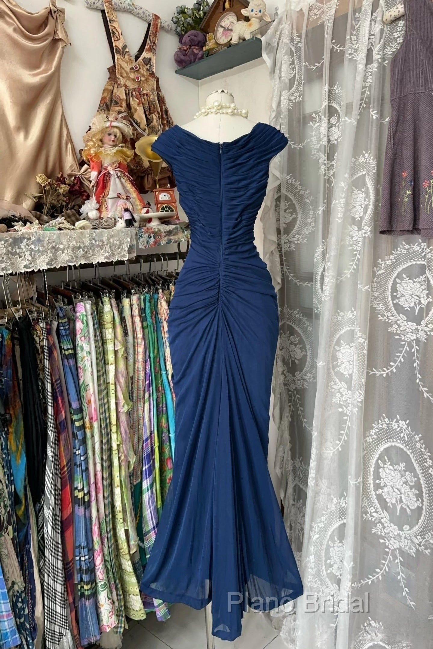 Vintage Fashion Mermaid V Neckline Navy Blue Floor Length Formal Dresses Formal Prom Dresses