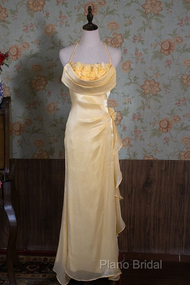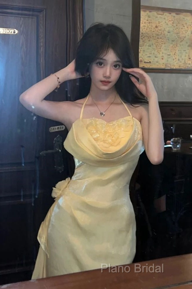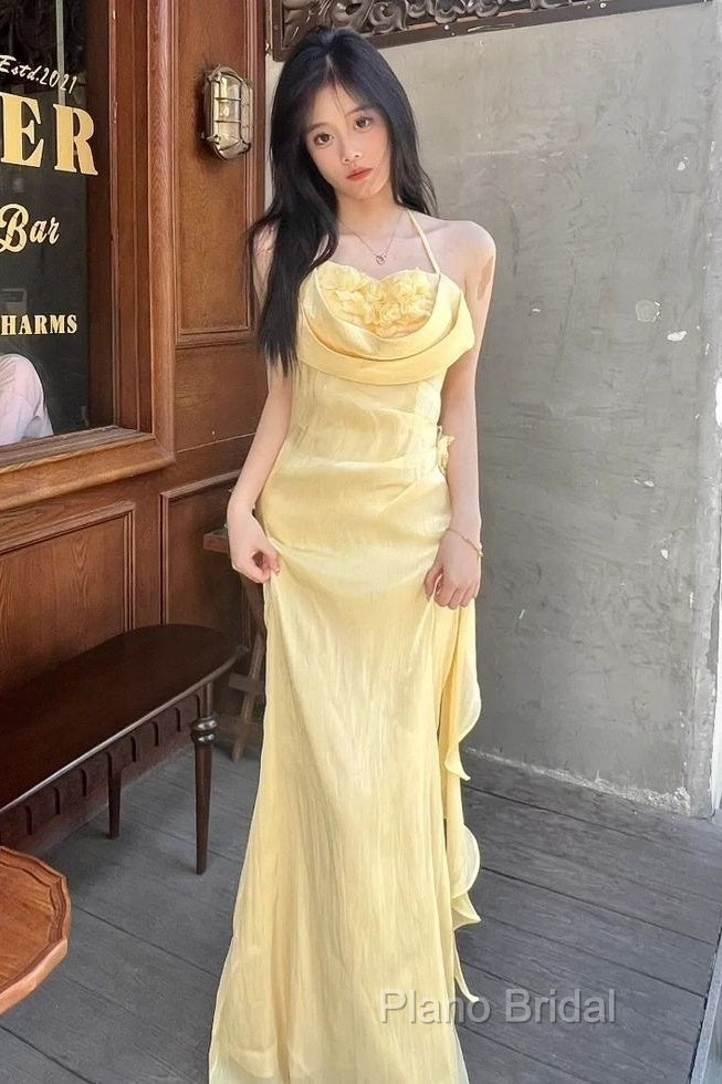 Vintage Yellow Halter Neck Floral Formal Prom Gown Fairy Princess Formal Prom Dresses